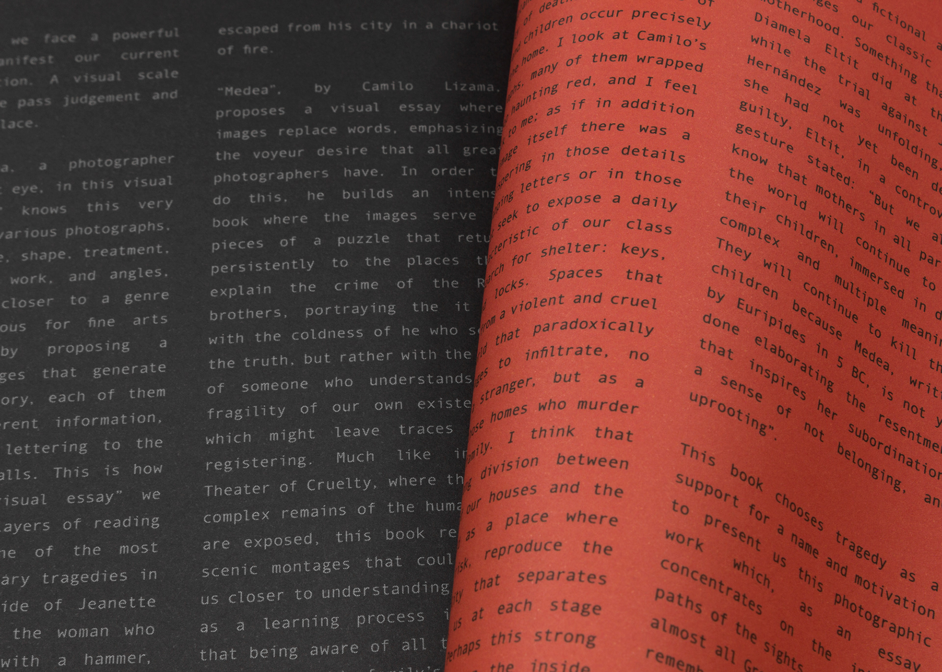 This book chooses tragedy as a support for a name and motivation to present us this photographic work which, as an essay, concentrates on the intricate paths of the sights and eyes as do almost all Greek tragedies. Let us remember Oedipus, King of Thebes, who tore his eyes after he learned that his wife was his own mother and that he had killed no less than his own father. Oedipus takes his eyes but still the images remain there because sight, the visible and what cannot be seen are very present significations in the decisions made by Camilo to narrate the tragic story of Medea.