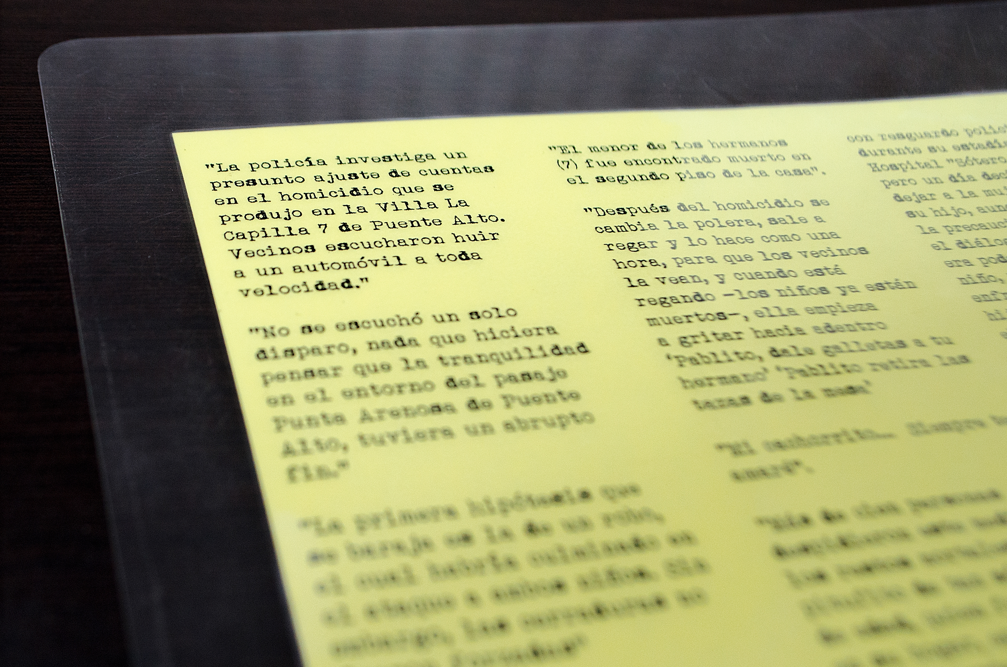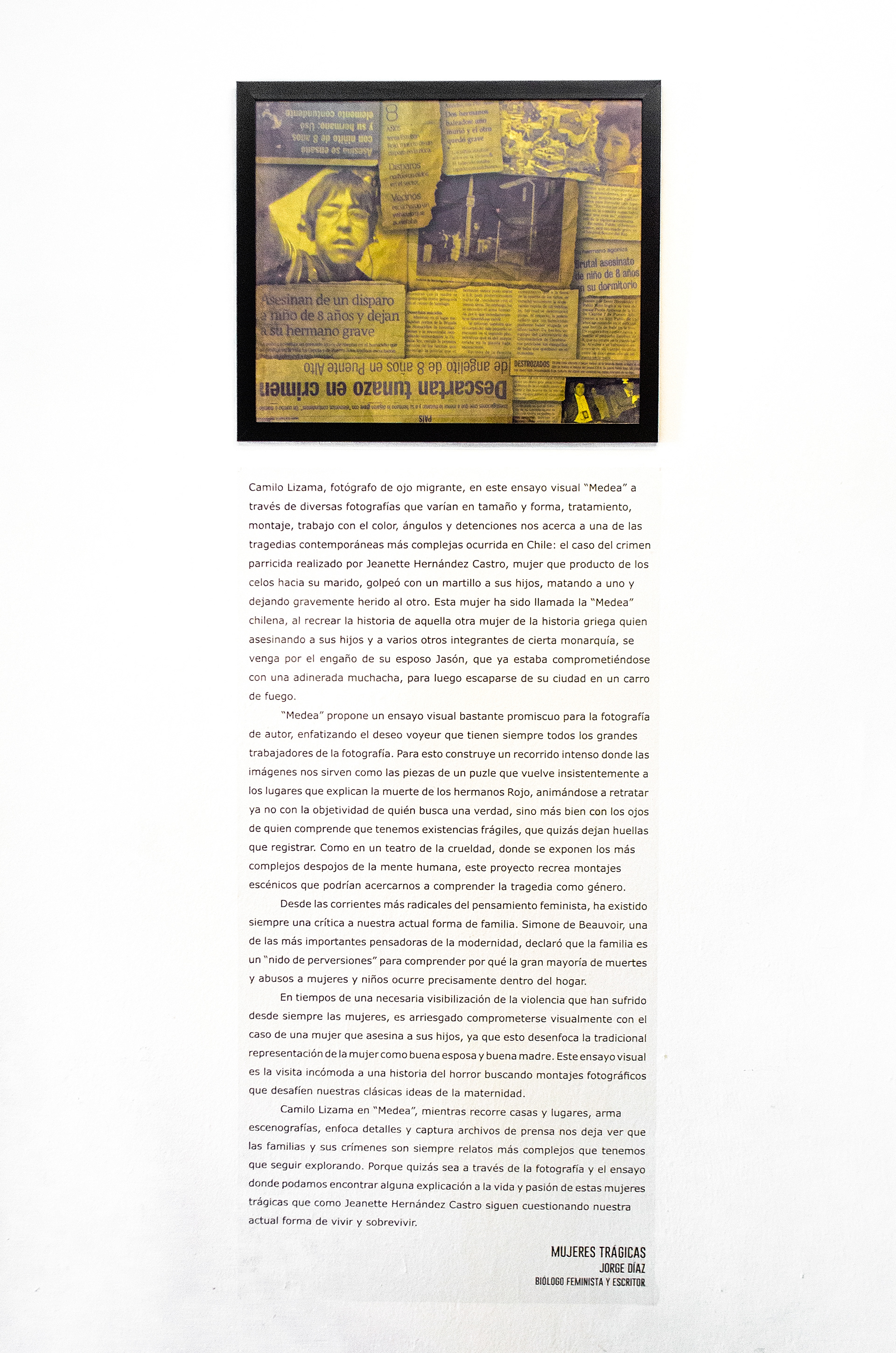 Camilo Lizama, a photographer with a migrant eye, in this visual essay knows this very well: through various photographs, varying in size, shape, treatment, editing, color work, and angles, he brings us closer to a genre quite promiscuous for fine arts photography, by proposing a variety of images that generate a fragmented story, each of them delivering different information, from the press lettering to the colours of the walls. This is how through this visual essay we enter different layers of reading and focus on one of the most complex contemporary tragedies in Chile, the parricide of Jeanette Hernandez Castro, the woman who struck her sons with a hammer, killing one and seriously injuring the other, all a product of her jealousy for her husband. This woman has been called the chilean Medea, evoking the story of the woman in Greek mythology, who murdered her children and several other members of a certain monarchy in revenge for the deceit of her husband, Jason, who was engaged with a wealthy girl and escaped from his city in a chariot of fire.